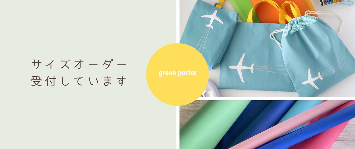 飛行機をアップリケした green porter オリジナルデザインです。 シンプルなデザインは、お子さまの成長と共に長く使っていただけます。 11号帆布のしっかりとした生地は、丈夫なので日常使いにぴったり。 通園通学に必要なレッスンバッグ 、シューズバッグ、体操服を入れる巾着袋などシリーズで揃えていただけます。 巾着袋は【 Mサイズ 】と【 Lサイズ 】をご用意しています。 【 Mサイズ 】 縦38cm 横32cm 幼稚園、保育園のお着替え入れに、 小学生の体操服入れに ちょうどいい大きさです。 【 Lサイズ 】 縦42cm 横35cm 小学生の体操服入れに ちょうどいい大きさです。 冬用の長袖長ズボンのジャージも入ります。 【 ナップサック 】 体操服巾着をナップサックに変更できます。 両手がふさがっている時、荷物の多い時などに便利です。 ロングタイプなら、ランドセルの上から背負えます。 【 お名前タグ 】 ご希望でお名前タグをお付けします。 縦 2.4cm 横 7cm 取り付け位置は【外側の後面、右下】です。 他の場所をご希望の場合は、備考欄にお書きください。 備考欄で「あり」を選んでいただきましたら記入欄が出てきます。 【 サイズ変更させて頂きます 】 大きくなる場合(+1200円) 小さくなる場合(+1000円) ご希望のサイズに変更させて頂きます。 タテ、ヨコのご希望サイズを備考欄にご記入ください。 備考欄で「あり」を選んでいただきましたら記入欄が出てきます。 *大きくなる場合の変更サイズは各辺 10cm までです。 *サイズに迷われた時は【 CONTACT 】よりお問い合わせ、ご相談ください。 *水洗い(中性洗剤)可能です。型崩れ防止のため手洗いを推奨しています。洗濯機をご利用の際はネットに入れて「おしゃれ着コース」や「手洗いコース」を選択してください。